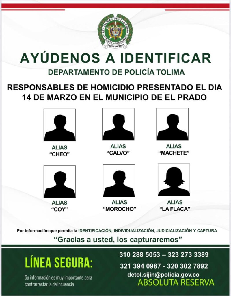 “Tan pronto se tuvo conocimiento de este hecho el Comando del Departamento dispuso un equipo especial de Policía Judicial e Inteligencia que iniciaron las labores investigativas para lograr el esclarecimiento de este homicidio. En medio de estas investigaciones se logró estableces los presuntos responsables conocidos con los alias de ‘Cheo’; “Calvo”, “Machete” “Coy”, “Morocho” y alias “La Flaca””, refirió el coronel John Anderson Vargas Izao, comandante de la Policía del Tolima.