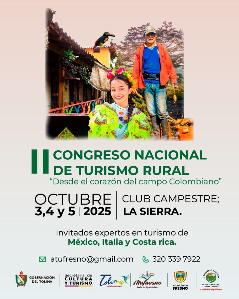 la Asociación Agroecoturística Atufresno organiza, con el apoyo de La Gobernación del Tolima, la Alcaldía de Fresno, el II Congreso Nacional de Turismo Rural, que reunirá experiencias de México, Italia y Costa Rica para fortalecer el agroturismo como producto turístico y socializar saberes que conectan lo cultural, lo ambiental y lo económico desde el corazón del campo.