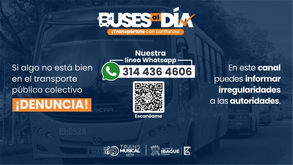 Con el fin de tener una cercanía con la comunidad y fortalecer la cultura ciudadana en el transporte público colectivo, la Alcaldía de Ibagué habilitó la línea de WhatsApp: 314 436 4606, para que los usuarios de buses puedan reportar de manera directa cualquier anomalía, queja o reclamo, relacionado con la prestación del servicio.
