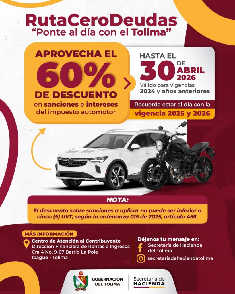 “Invitamos a todos los tolimenses a aprovechar este descuento y contribuir con sus impuestos, recordando que son recursos invertidos en educación, salud y deporte”, concluyó.