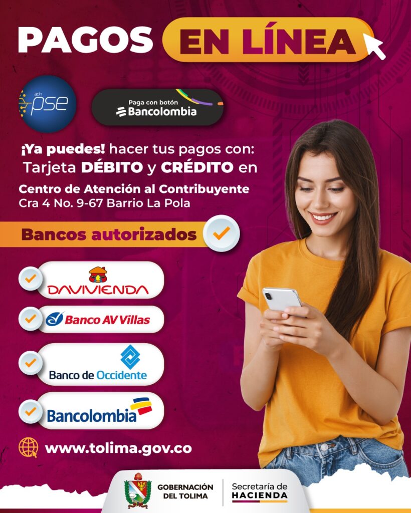 O puede acercarse al centro de atención al contribuyente ubicado en la carrera 4ª #9-67, barrio La Pola, Ibagué, donde puede pagar en efectivo, tarjeta débito y crédito en el banco Davivienda.