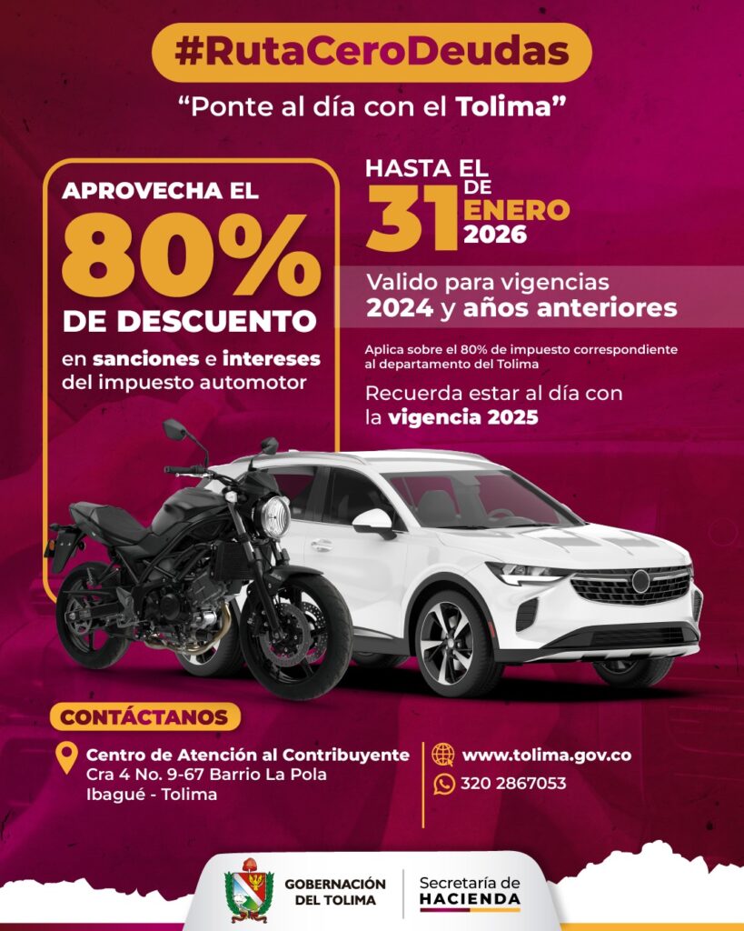 La Gobernación del Tolima, a través de la Secretaría de Hacienda y la dirección financiera de rentas e ingresos, anunció la entrada en vigencia de los beneficios tributarios que permiten a los propietarios de vehículos automotores ponerse al día con su impuesto, accediendo a importantes descuentos en sanciones e intereses por obligaciones correspondientes a las vigencias 2024 y anteriores.